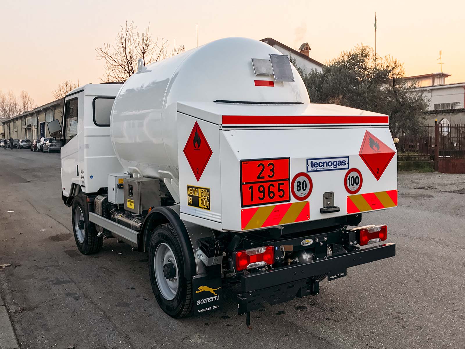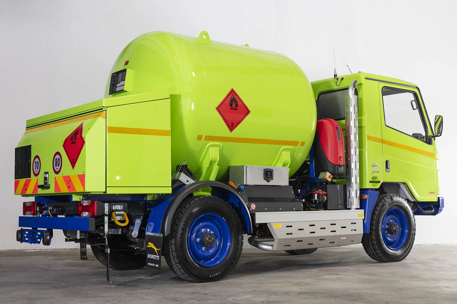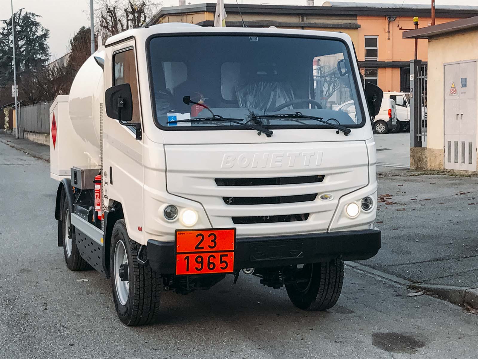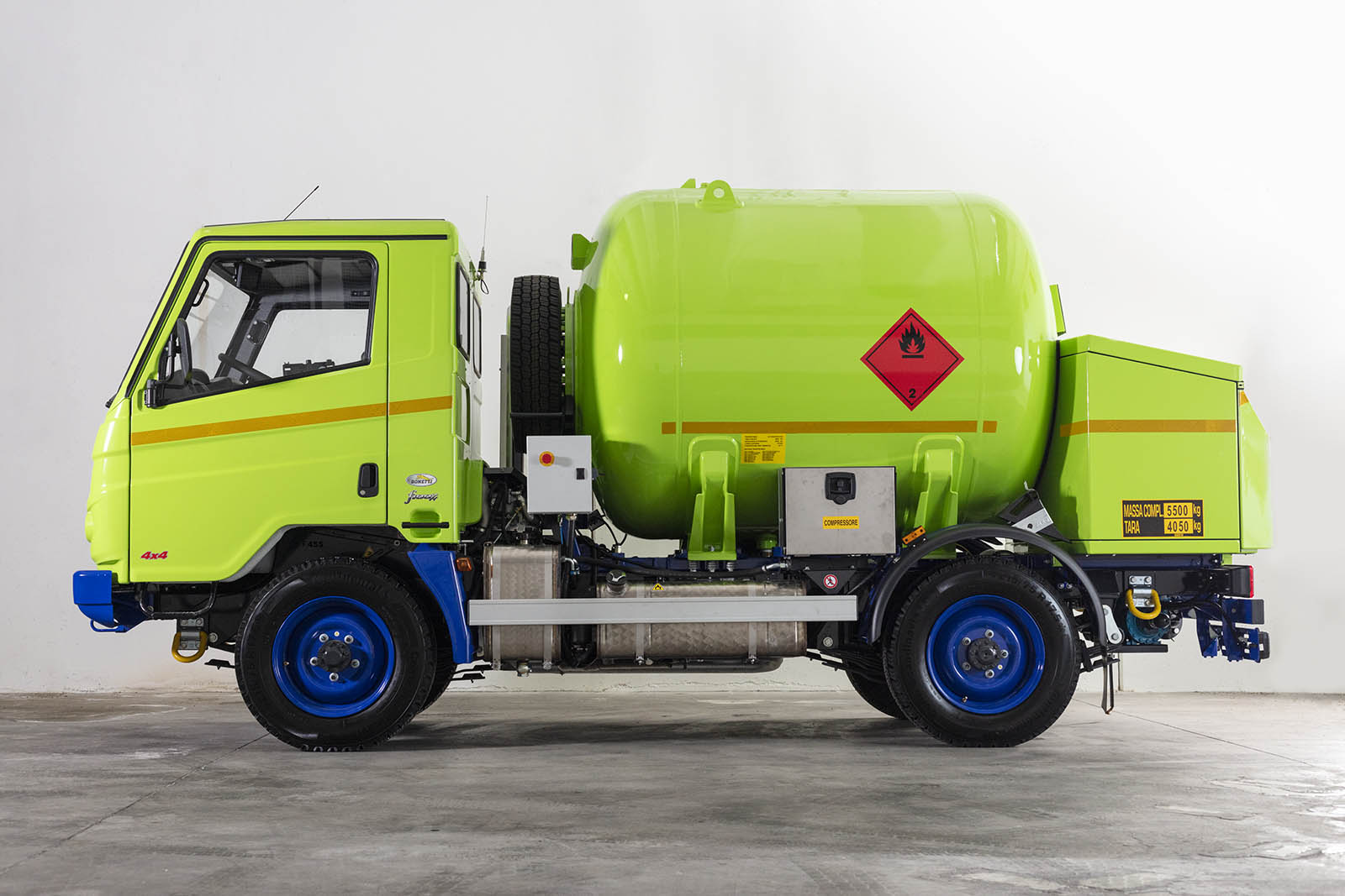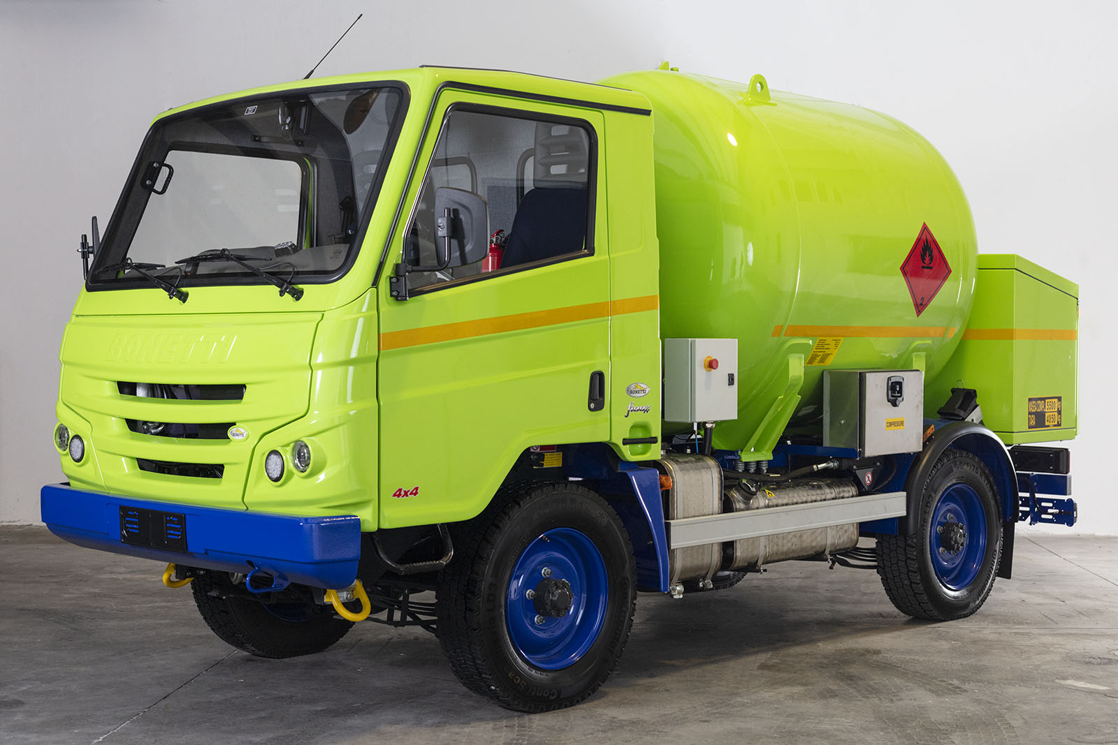 Telaio personalizzato BONETTI (categoria N2G – passo 2.550 mm) che viene fornito con una serie di accessori specifici, come cablaggi elettrici / staccabatteria / tachigrafo in ADR. L’allestimento a completamento viene prodotto a seconda delle esigenze del cliente e generalmente la cisterna è sviluppata con una capienza di circa 3500 lt.